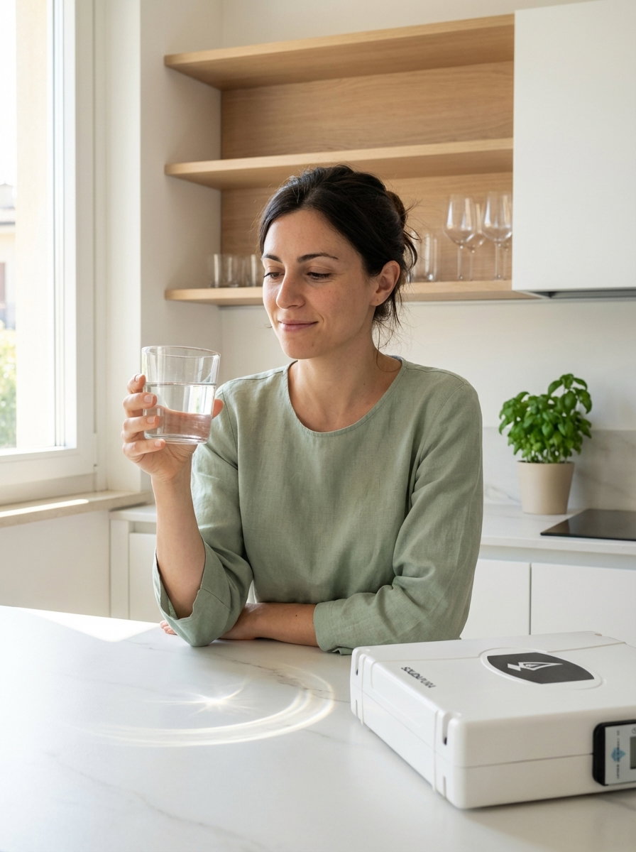 Non ci credevo molto. Mio marito mi ha convinto. Ora beviamo solo acqua filtrata, spendiamo meno e non dobbiamo più portare su le bottiglie dal piano di sotto.