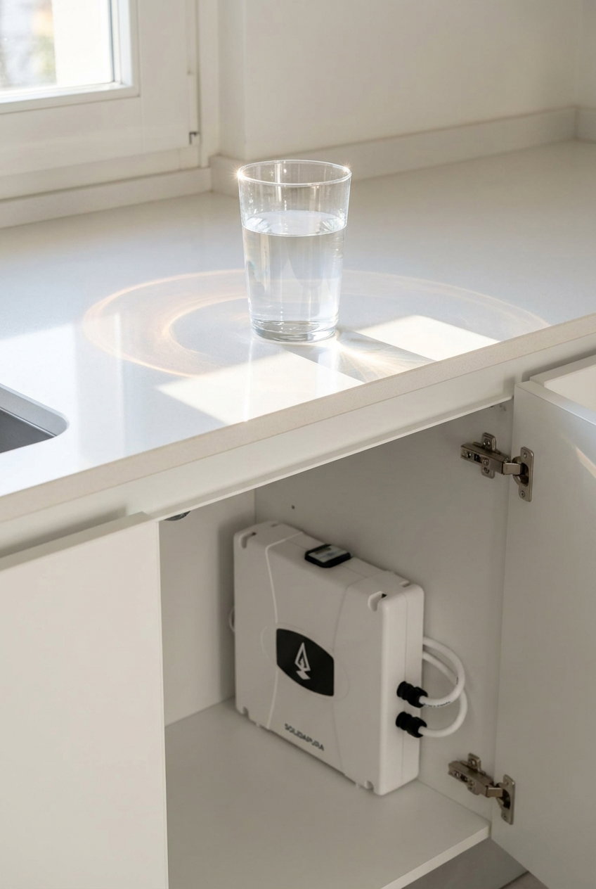 Solida Pura filtra l'acqua direttamente dal rubinetto con doppia microfiltrazione, a temperatura ambiente. Acqua più pulita, sempre disponibile, senza dover comprare niente.